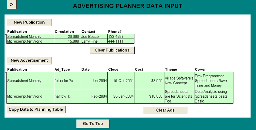 Advertising planner data input form