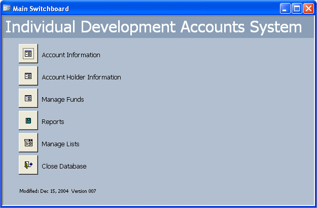 IDA Manager is a powerful system that helps you efficiently manage and administer your IDA program. IDA Manager is available both as an add-on module for MIMOTA and as a stand alone system. IDA Manager records, tracks, and reports information on grants, program participants, banks associated, and matching funds. Click on a feature to learn more.
