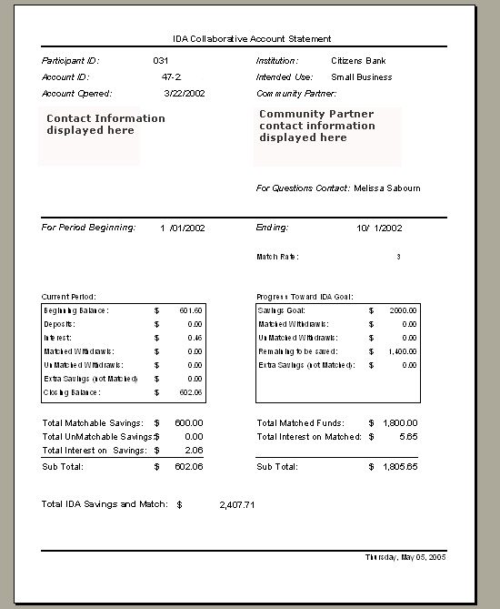 (urban/rural), etc. You can record information on unlimited community based partners and associate them with members/clients of your IDA program. You can also record and track information on referral managers at the partner organizations. If you do not deal with community partners for your IDA program you can just disable this functionality in the system. You can track unlimited grants or funds in the program. A status table displays real time data on the breakdown statistics of every fund in your program. Information on original dollars sanctioned, committed dollars, uncommitted dollars, and paid dollars is tracked for every grant/fund. IDA Manager offers a flexible matching ratio for every deposit made by a member. You can change the matching ratio for selected months or opt for a fixed matching ratio until the member graduates. You can also set monthly savings target, and limits for matching dollars. Track the source of every dollar that is matched for a member’s deposit (even if you have multiple funds/grants contributing matching dollars for a single account). IDA Manager allows you to have 100% control in assigning and tracking dollars in the program. You can also generate summary reports on all matchings and dollar contributions. You can generate a wide variety of reports from the data collected in the system. By default, you get up to 20 standard reports with built-in filtering options. We can also custom develop reports for your specific submissions and analysis. Some of the reports offered with the system are described below.
